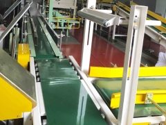 该机为皮带输送机,和倒袋机组合一起实现将立姿料袋自动放倒。自动感应系统检测到有包装袋到位后,把倒袋信号传送给倒袋机,使倒袋机自动实行倒袋工作。